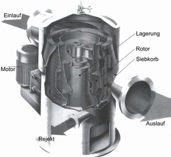 Bei Faserstoff aus Altpapier werden in dieser Position Schlitzkörbe vom Typ der Stabsiebe mit engen Schlitzen von 0,25-0,35mm oder auch Scweißspaltsiebe verwandt.Der Druckverlust durch die Siebfläche des Sortierers beträgt ca. 0,2 bar.