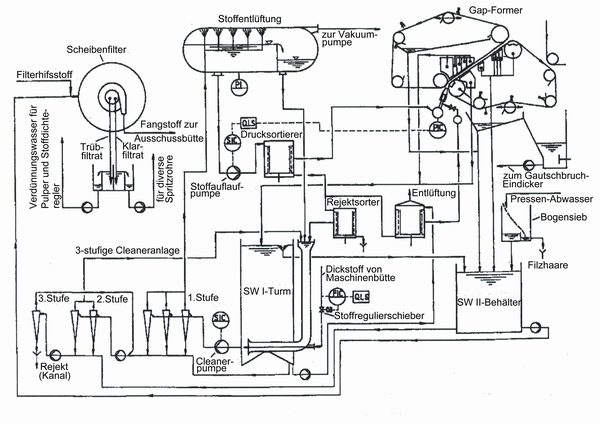 Für die Reinigung von Sieben und Filzen in der Naßpartie (Naßpartie = Siebpartie und Pressenpartie) mit Spritzrohren muß der Feinstoffgehalt im Siebwasser von z.B. 2000 mg/l (Siebwasser 2) noch weiter verringert werden. Andernfalls könnten Verstopfungen in Spritzrohren oder Verschmutzungen auftreten.Die Restfasern im Siebwasser 2 können durch Filtration,oder Flotation in der Faserrückgewinnung bis auf 50-100 mg/l entfernt werden.Für die Filtration wird meist ein Scheibenfilter eingesetzt.Um die Restfasern aus dem Siebwasser 2 zu holen,ist eine Filterhilfsschicht mit langen Fasern erforderlich.Meist besteht diese aus einem Teil des Dickstoffs,aus dem das Papier hergestellt wird.Diese Filterhilfsschicht wird mit Siebwasser vermischt, bevor es auf den Scheibenfilter gebracht wird.Die langen Fasern legen erst eine Filterschicht auf die Siebsegmente des Scheibenfilters.Hierdurch bleiben die kurzen Fasern und Feinstoffe aus dem Siebwasser in der Filterschicht hängen.Bei Papieren mit hohem Füllstoffgehalt setzt man für die Faserrückgewinnung oft auch eine Mikroflotationsanlage ein (Abb.3).Dem zu reinigenden Siebwasser wird ein Flockungsmittel zugegeben und danach wird Luft eingeblasen und das Wasser einem großen Behälter zugeführt,der eine geringe Bauhöhe und eine große Oberfläche hat.Die Fein- und Füllstoffe werden an die Luftblasen angelagert und steigen an die Oberfläche auf,wo sie abgeschöpft werden.Das zurückgewonnene Fasermaterial wird in beiden Fällen vor die Mischpumpe zurückgeführt und dem Gesamtstoff zugegeben.