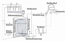 Der Siebwasserturm ist direkt mit der Ansaugleitung der Pumpe im Hauptstrom ,der Mischpumpe,verbunden.In die Verbindungsleitung zur Pumpe wird eine geregelte Menge Dickstoff zugegeben.Der Gutstoff aus der Sortierung und Faserrückgewinnung im Konstantteil wird ebenfalls wieder vor die Mischpumpe zurückgeführt.