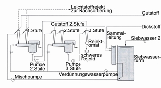 In einer mehrstufigen Anlage wird die Qualität der Sortierung durch die erste Stufe bestimmt.Der Wirkungsgrad der Installation ergibt sich durch Trennung von Fasern und Verunreinigungen in den nachfolgenden Stufen.In der ersten Stufe können auch leichte Verunreinigungen ausgeschieden werden.Abhängig vom Druckunterschied und der Öffnung an der Rejektseite der Cleaner findet eine Eindickung des Rejekts statt.Diese kann den Faktor 2 bis 4 im Verhältnis zue Einlaufstoffdichte betragen.Zwischen den verschiedenen Stufen wird meist verringerte inlaufstoffdichte von 0,15-0,2% eingestellt.Die Verdünnung für die folgende Stufe findet über eine Niveauregelung im Rejektbehälter statt.Das Wasser für die Verdünnung wird dem Siebwasserturm entnommen.Die maximale Verdünnung,die erreicht werden kan,ist abhängig von der Konsistenz vom Siebwasser 1.Für die dritte oder vierte Stufe kann auch Siebwasser 2 eingesetzt werden.